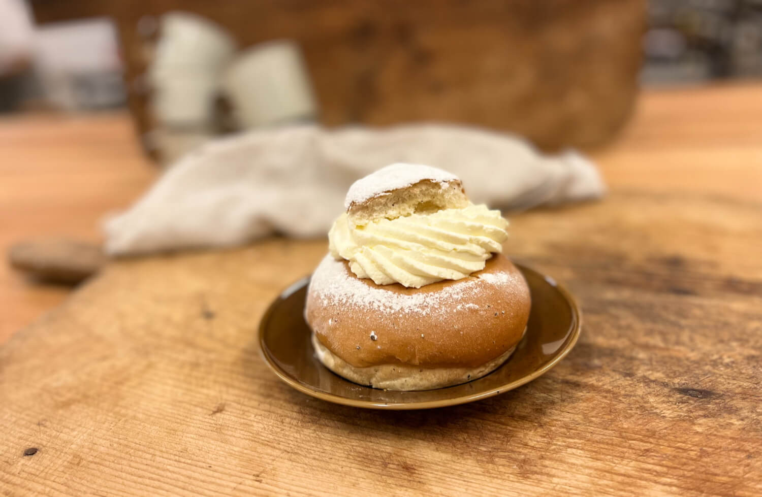 Surdegsbulle med kardemumma, spritsad mandelmassa och grädde. Överst, ett lager tosca! Supergod!